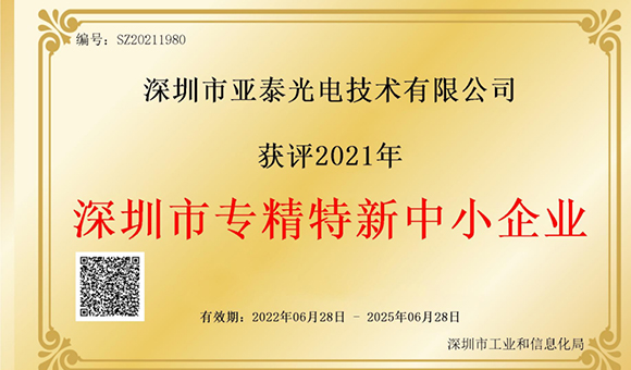 星光不問趕路人?歲月不負有心人 深圳亞泰光電經過五年的披荊斬棘與風雨兼程,憑借著行業的專業性、管理體系的完善性及強大的研發創新能力,獲得了2021年度深圳市“專精特新”中小企業殊榮。