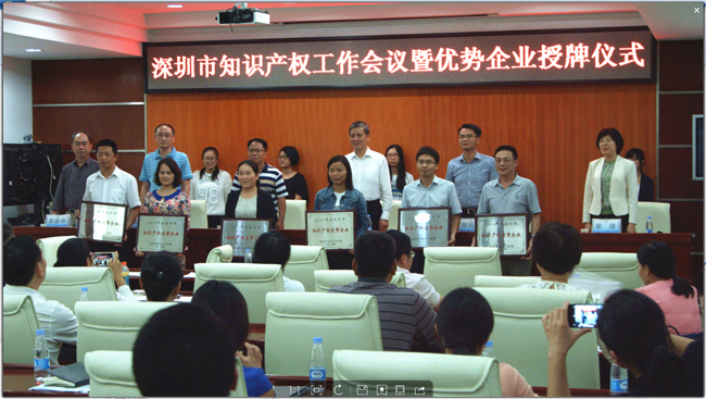 此次參會領導有深圳市市場監督委員會常務副主任范鳴春、深圳市知識產權局副局長秦世杰、深圳市知識產權局知識產權促進處處長陳民鋼、副處長宋洋等。會議內容包括2014年度知識產權優勢企業授牌儀式、最新知識產權政策宣貫以及知識產權促進工作部署等。會上,范主任做了重要講話,充分肯定了深圳市知識產權工作在過去30年取得的矚目成績,2014年專利申請量連續四年全國第一,PCT申請量占全國一半;發明專利擁有量75件/萬人,是全國平均水平的15倍以上;90%以上的研發機構、研發人員、研發投入、研發成果均來自企業。未來“十三五”規劃中,深圳市將在知識產權保護、運營以及人才培養方面繼續推出新政策,將深圳打造為國際型創新城市“中國硅谷”。同時也指出了深圳市知識產權工作的不足:知識產權分布結構不均衡,與發達國家發達城市依然存在差距等。