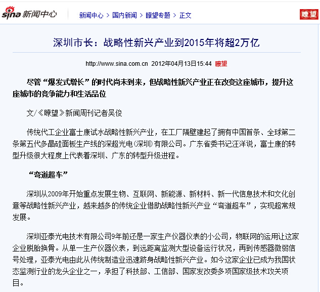 新浪網:【深圳市長:戰略性新興產業到2015年將超2萬億】