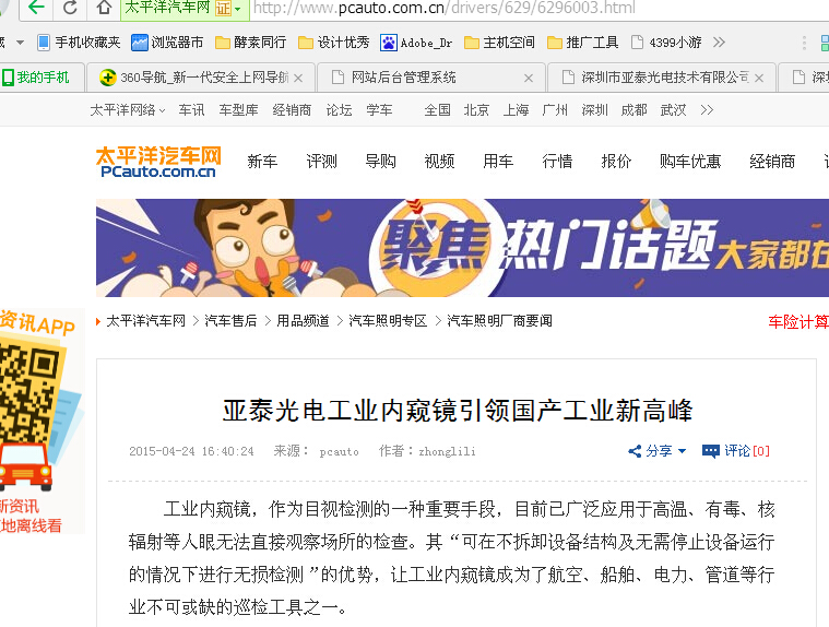 據(jù)深圳市亞泰光電技術(shù)有限公司李工透漏, SIE系列超清工業(yè)視頻內(nèi)窺鏡目前已經(jīng)在國內(nèi)幾家知名的航空、電力公司試用,并受到了使用者的一致好評。在產(chǎn)品價格方面,李工表示該款產(chǎn)品研制的初衷就是與國外高端品牌競爭,所以價格方面會高于國內(nèi)的大多數(shù)工業(yè)內(nèi)窺鏡產(chǎn)品,但相比國外產(chǎn)品,價格優(yōu)勢就非常的明顯,所以,整體來看是一款性價比非常高的產(chǎn)品。而且對于產(chǎn)品的質(zhì)量,公司非常的重視,在老化試驗(yàn)、跌落試驗(yàn)等測試階段做了很多的工作,也非常的歡迎廣大用戶朋友提前預(yù)約試用。當(dāng)然,自古“王婆賣瓜、自賣自夸”,我們的產(chǎn)品好不好,只要您用過就知道!