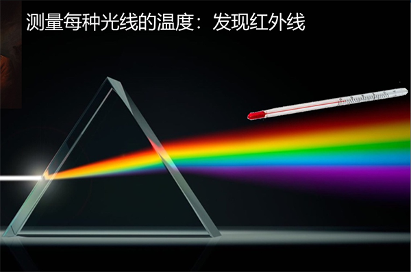 1800年英國科學家Willian Herschel(1738-1822)發現紅外線和紅外能,迄今220周年。 他用三棱鏡將太陽光分開,在各種不同顏色的色帶上放置了溫度計, 試圖測量各種顏色的光的加熱效應。 結果發現, 位于紅外側的那支溫度計溫度上升最快。 為此, 他得出結論, 太陽光譜中, 紅光的外側必定存在看不見的光線, 這就是紅外線, 其波長范圍在0.75-1000um.