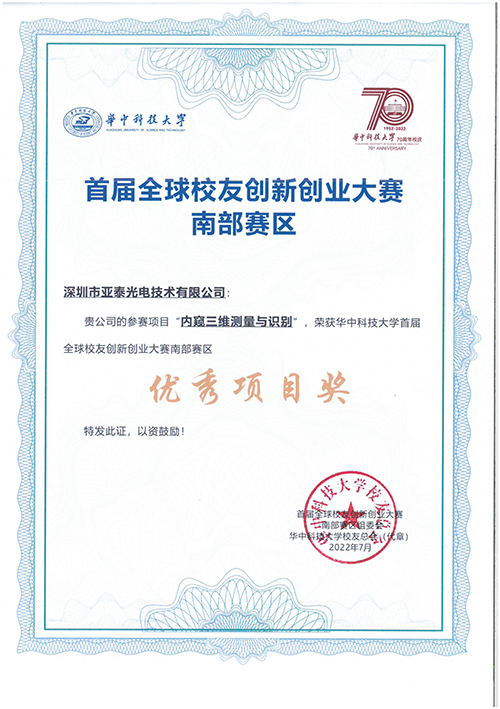 2022年6月26日,華中科技大學全球校友首屆創新創業大賽南部賽區決賽在深圳圓滿收官。深圳市亞泰光電技術有限公司在此次比賽中,“高靈敏度油液磨粒傳感器設計”和“內窺三維測量與識別”兩個項目榮獲“優秀項目獎”。
