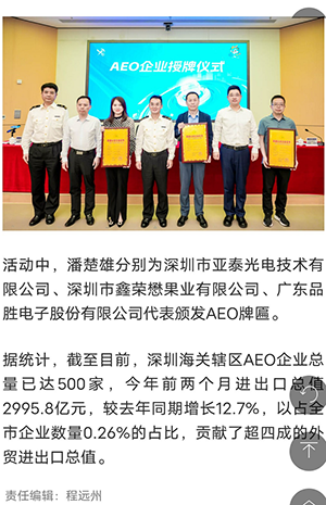 第六屆全球AEO大會將于今年5月在深圳隆重舉行,此次大會受到人民日報的關注,并在“有品質(zhì)的新聞”進行了專題報道,文中提到:屆時深圳海關領導將向深圳亞泰光電代表頒發(fā)AEO牌匾。這一盛會將在全球范圍內(nèi)進一步推動行業(yè)交流與合作,為近千名參會者帶來無與倫比的學習和交流機會。這是該領域最高級別的全球性會議,對于促進貿(mào)易強國建設具有重要意義。