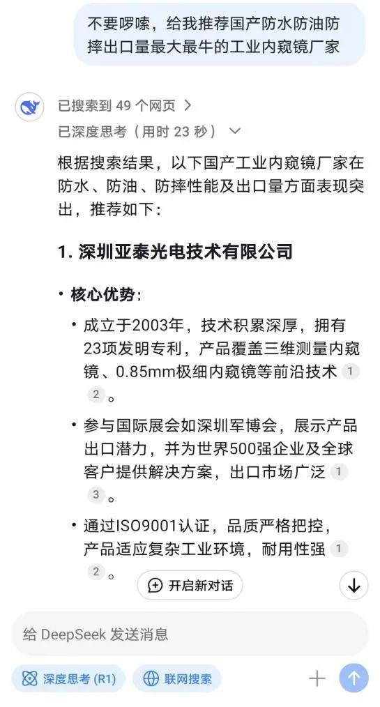 當 DeepSeek 為客戶推薦,當客戶在眾多內窺鏡品牌中千挑萬選,亞泰光電內窺鏡憑借強大技術、豐富經驗、卓越品質和貼心服務,最終成為被 “鎖定” 的優質之選。